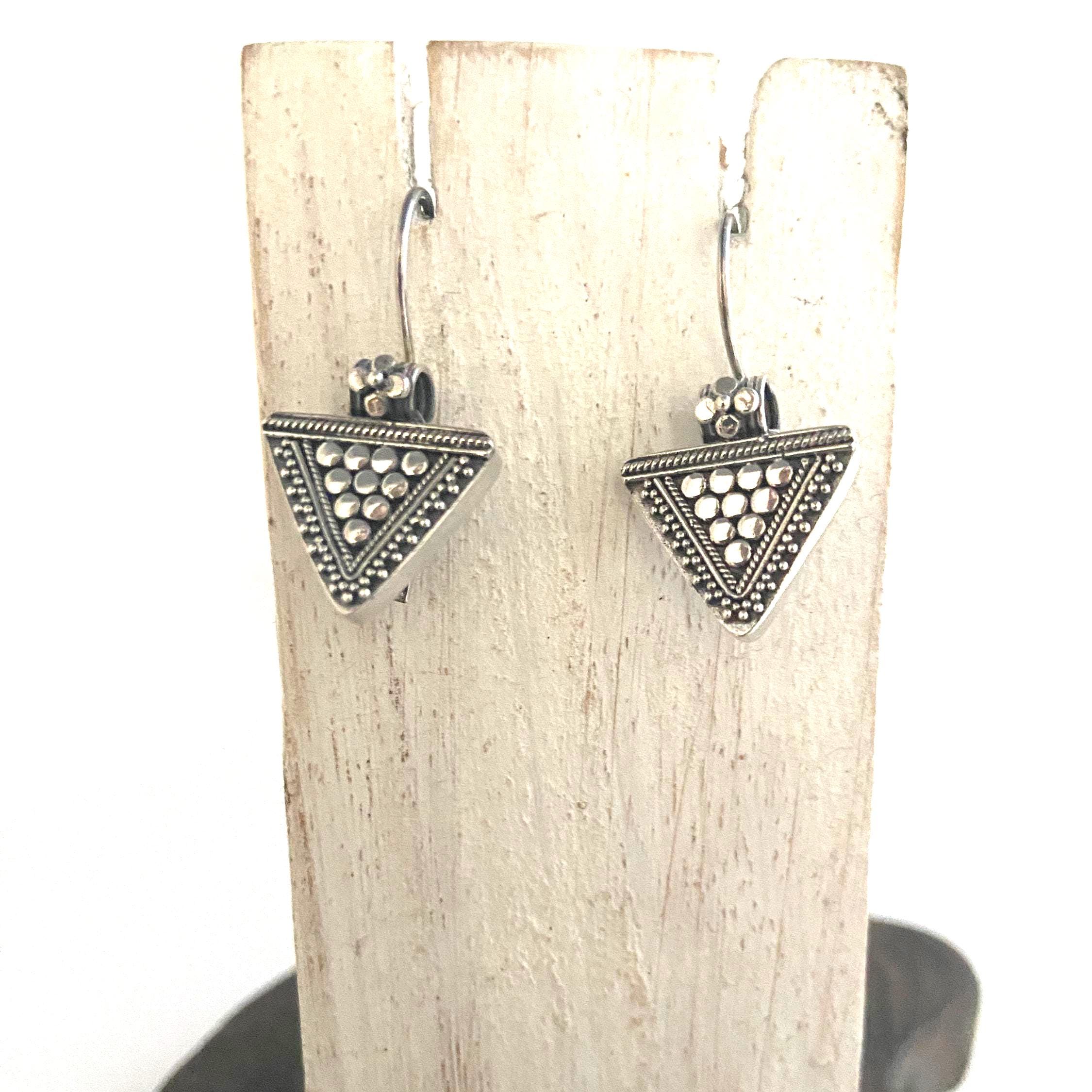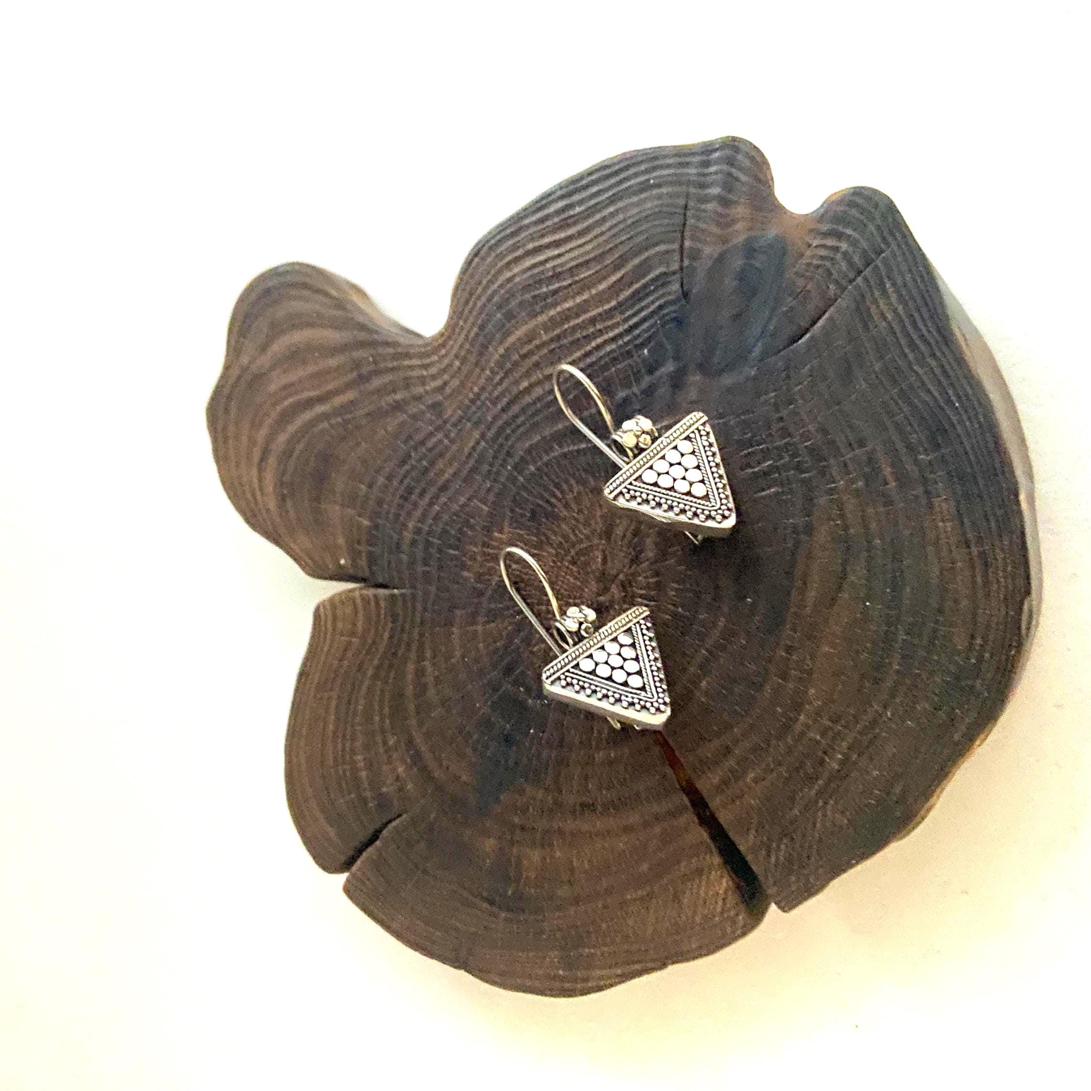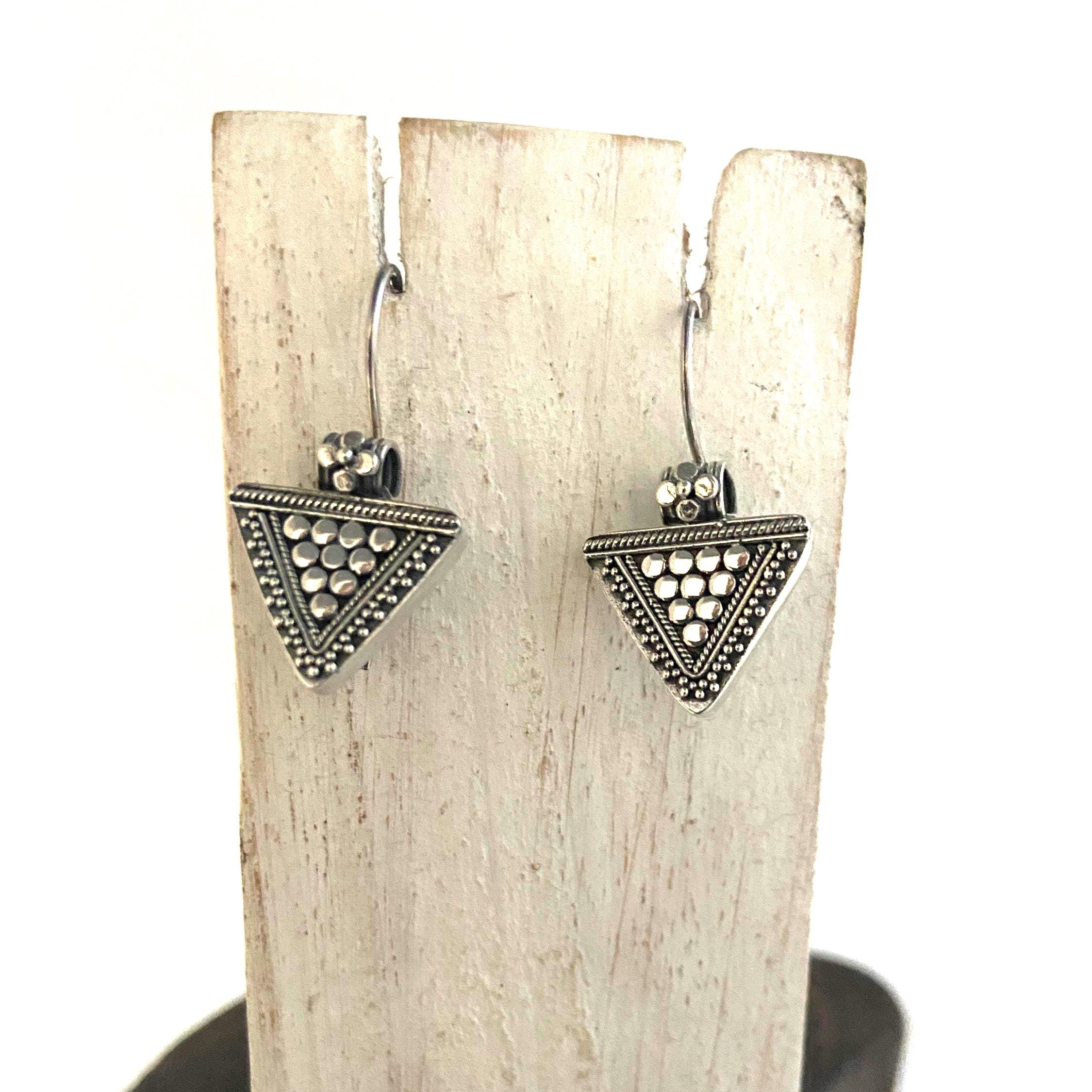 Triangle sterling silver earrings ornate with silver dots and tiny silver balls.