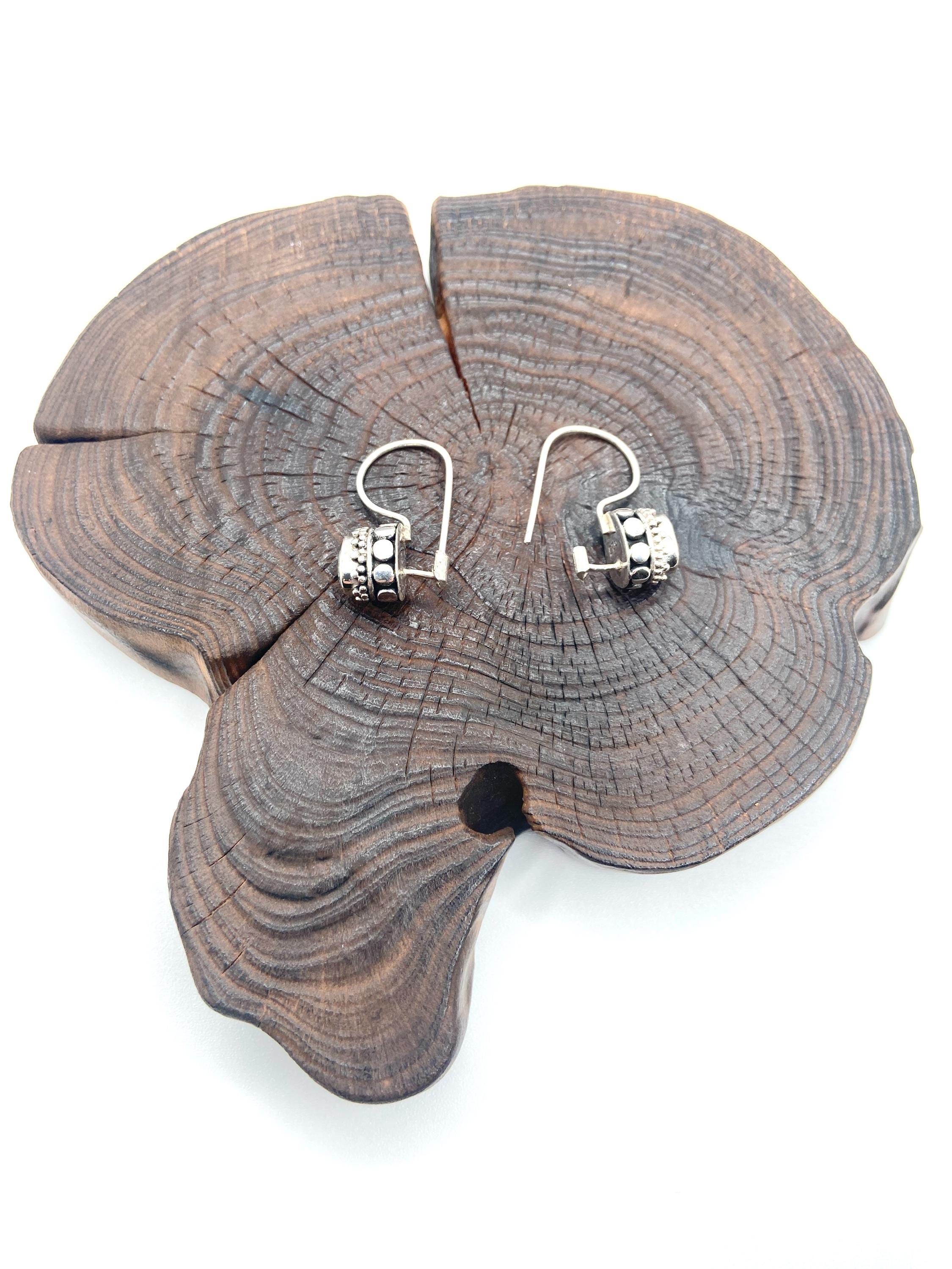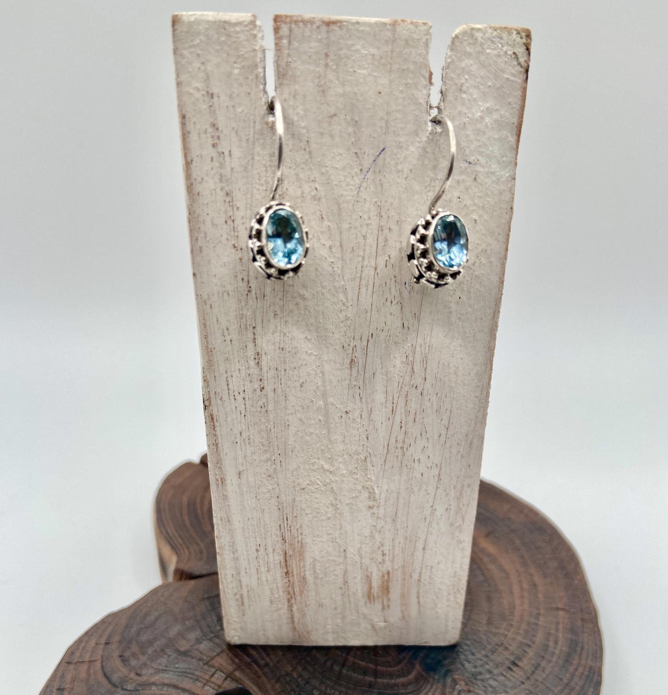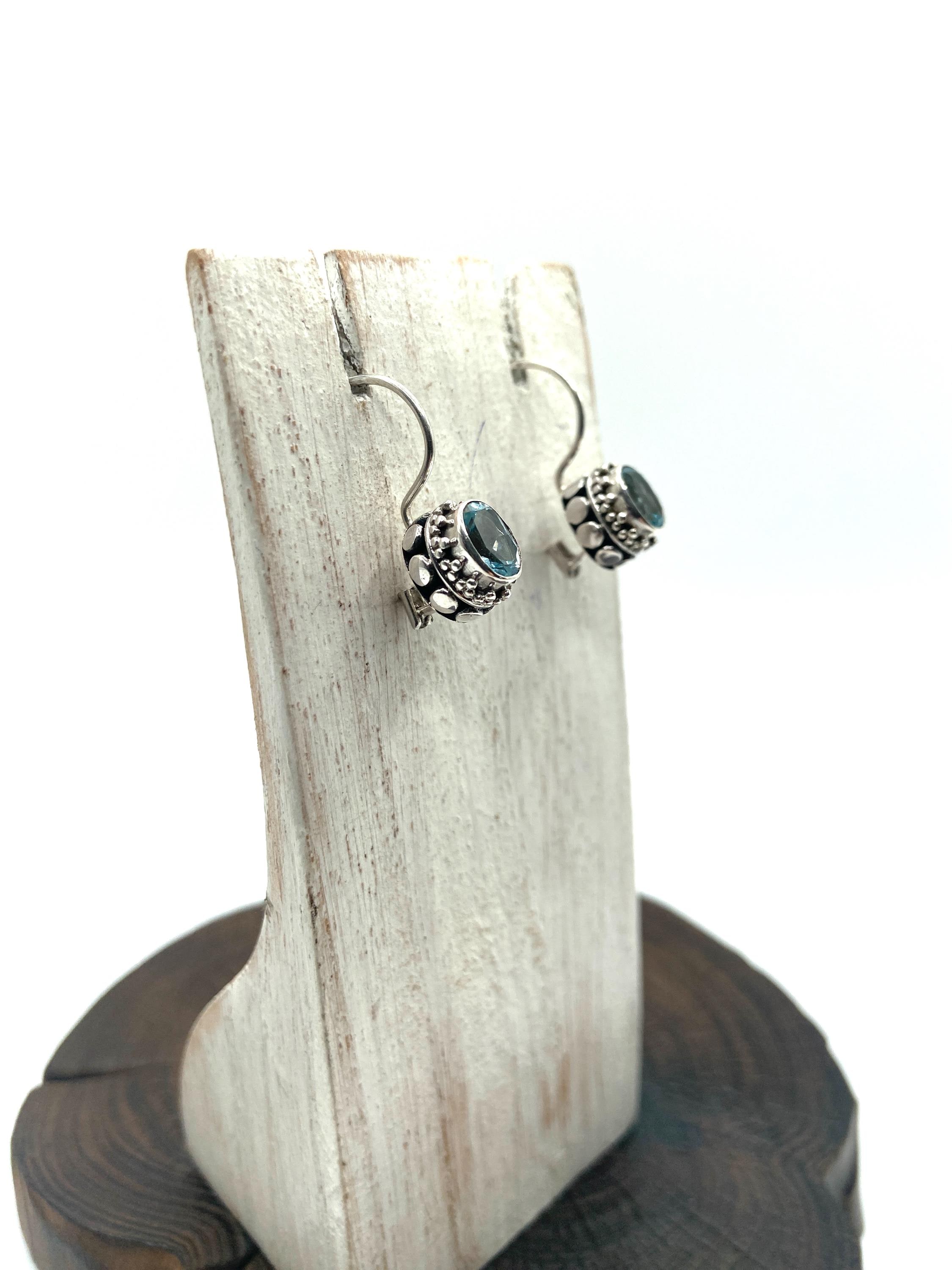 Nice blue topaz dangle earrings with dots on the side of the frame.