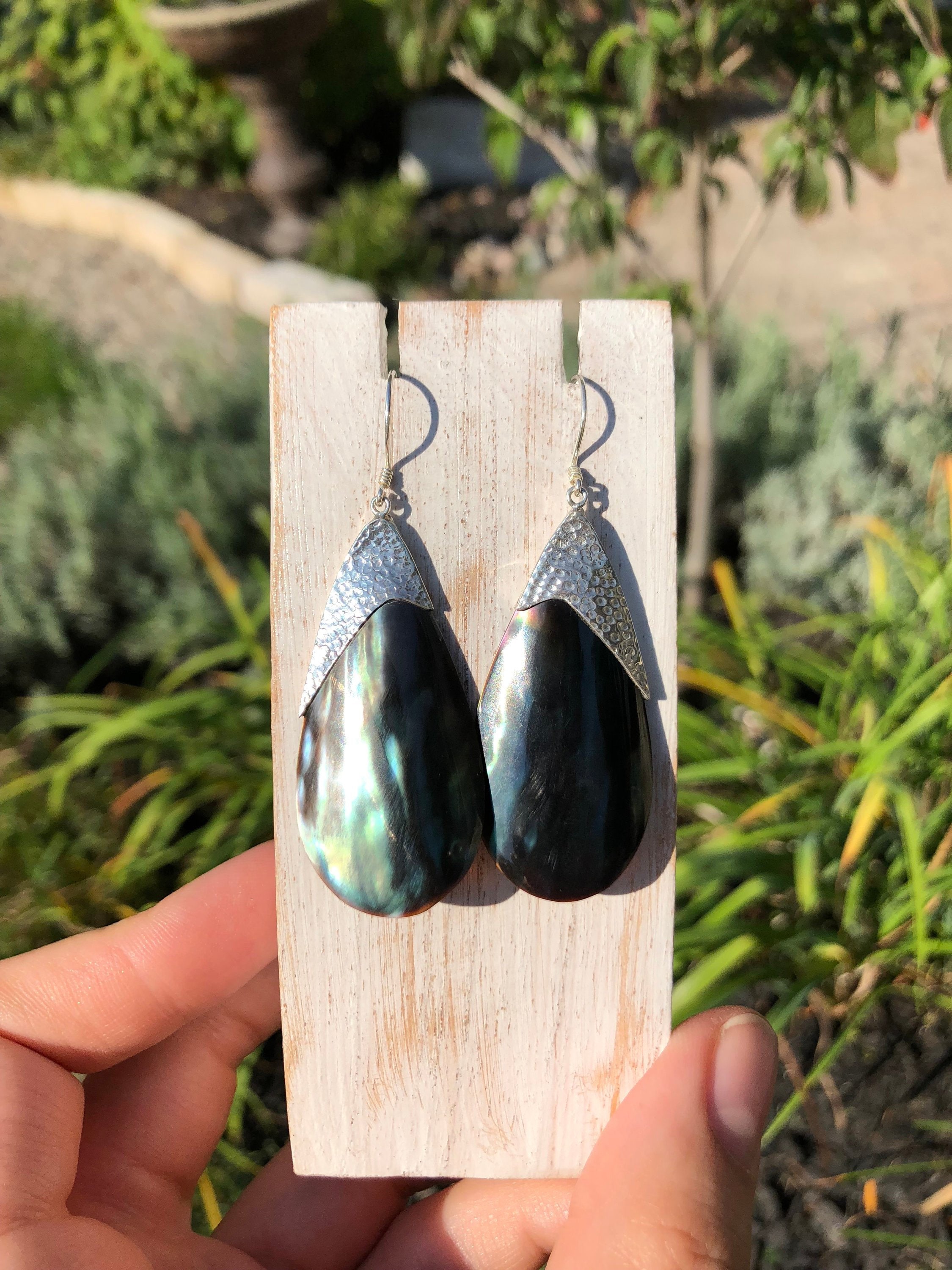 Green Shell earrings, beautifully hammered sterling silver.