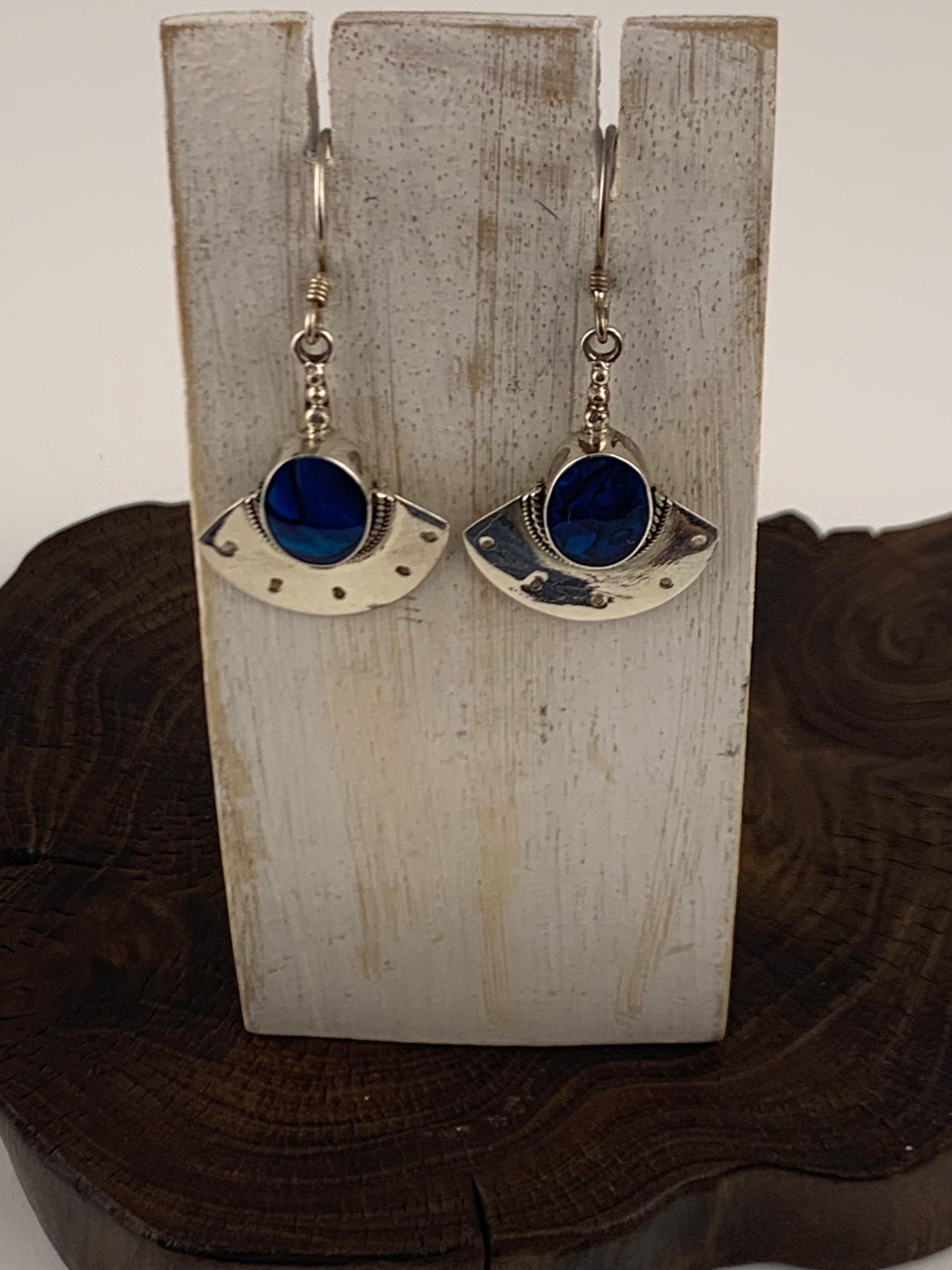 Blue Paua Shell stunning sterling silver lens fan shaped earrings with hook.