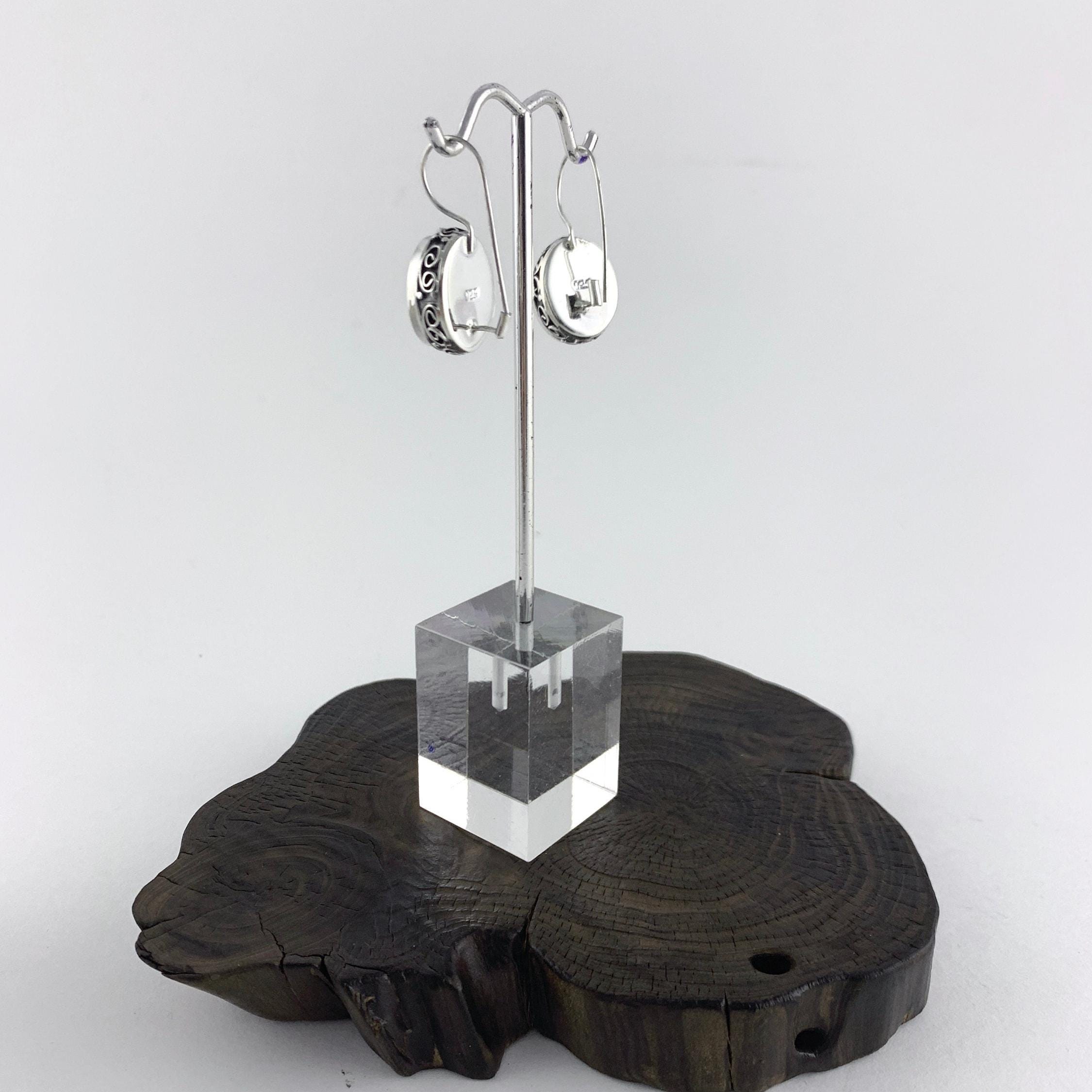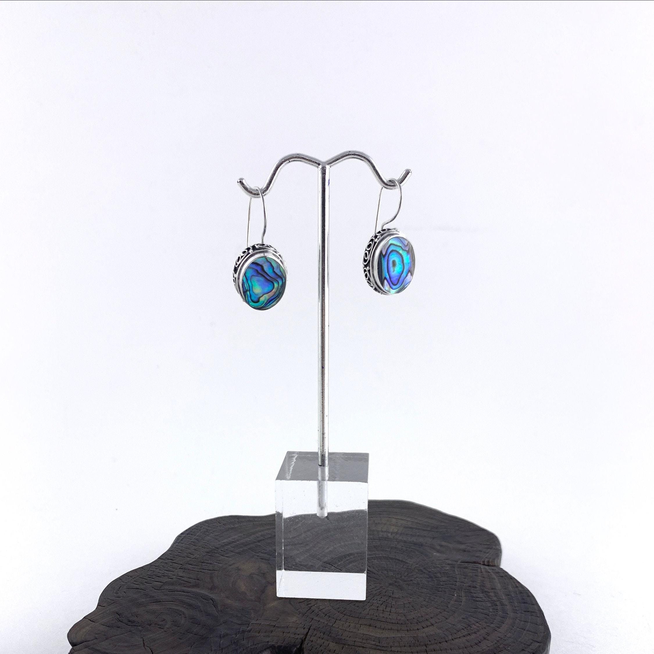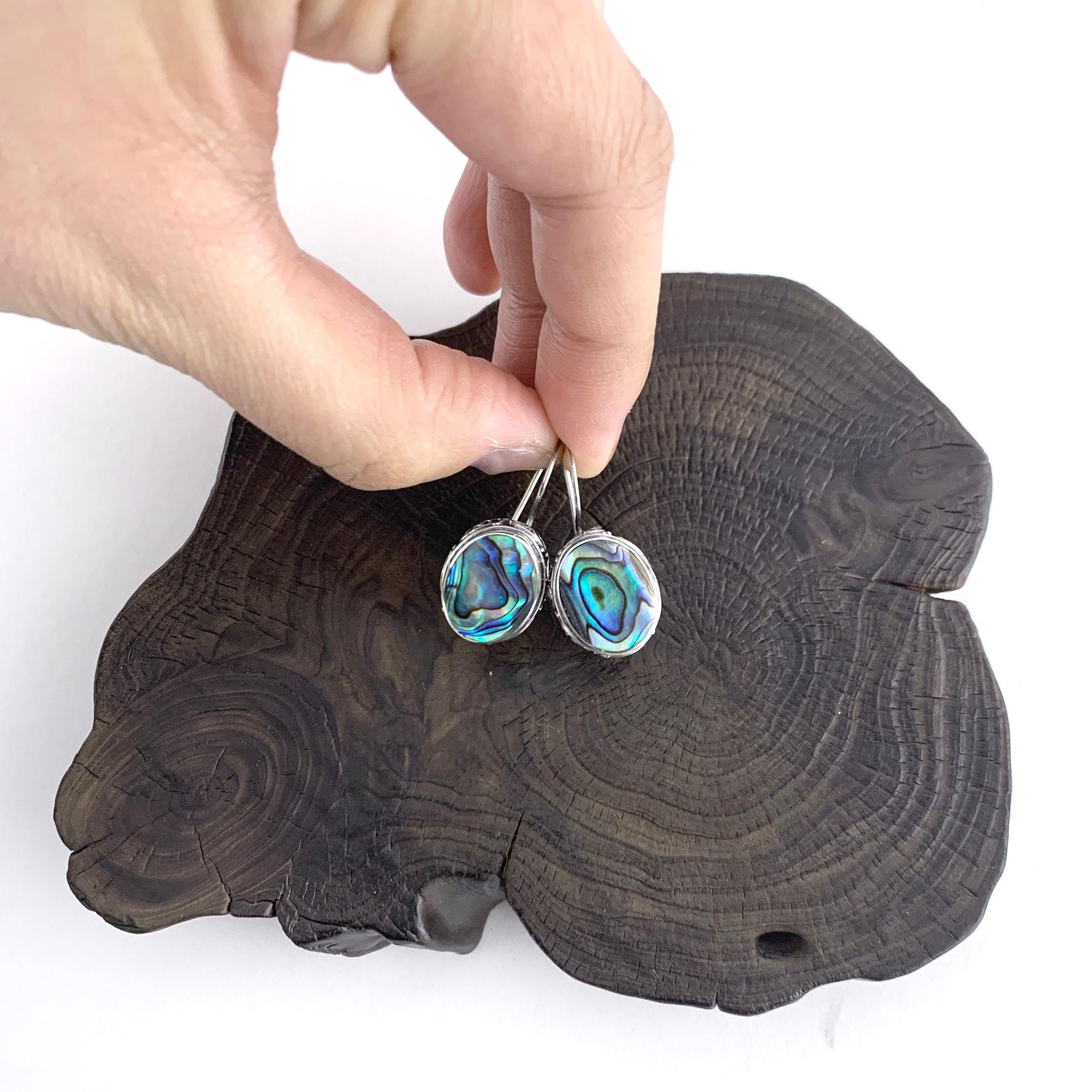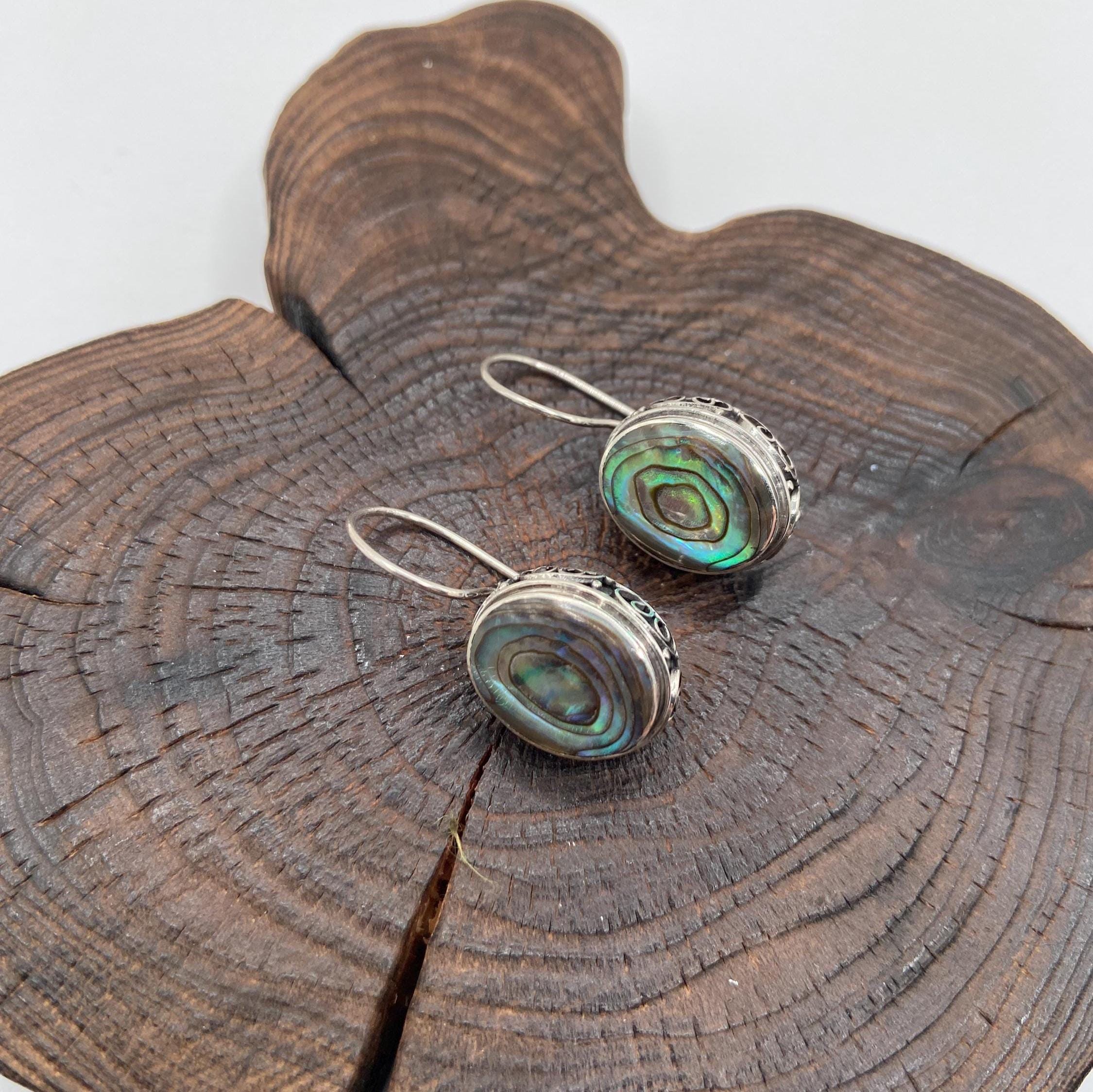 Abalone Shell Earrings: Sterling Silver, Oval Dangle Earrings with Intricate Silver Side Design